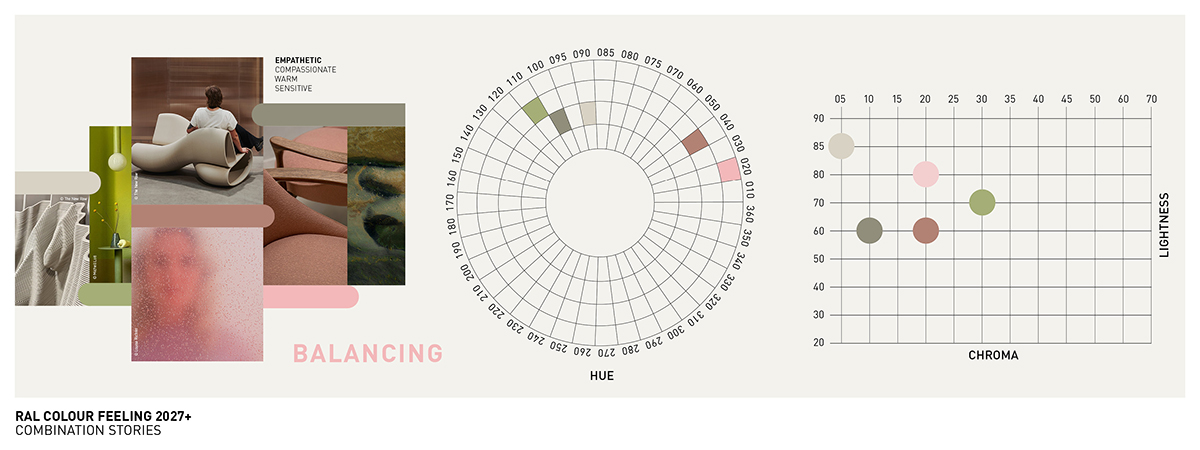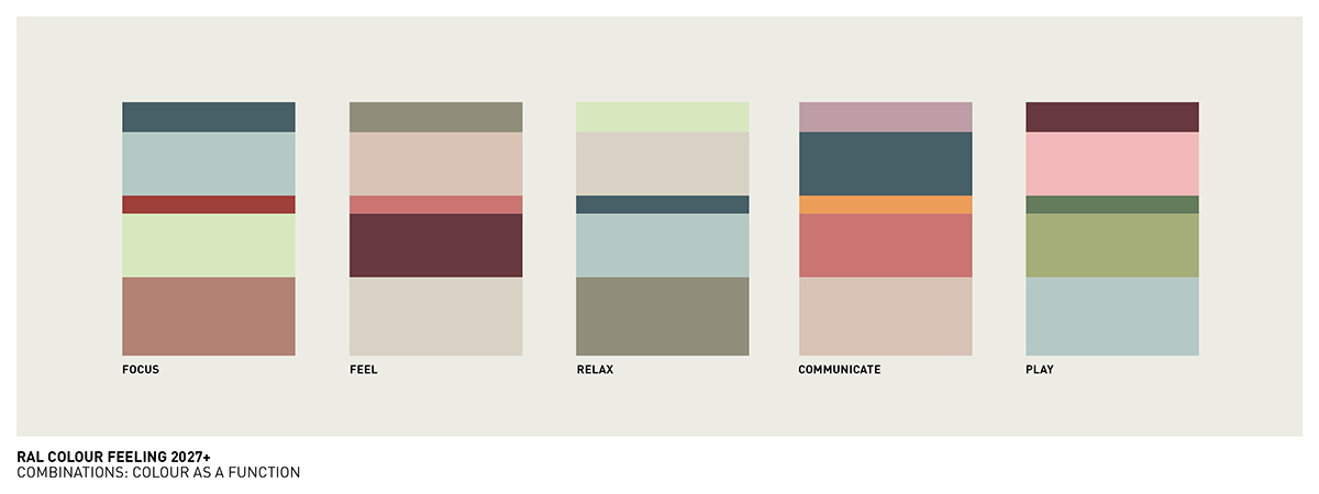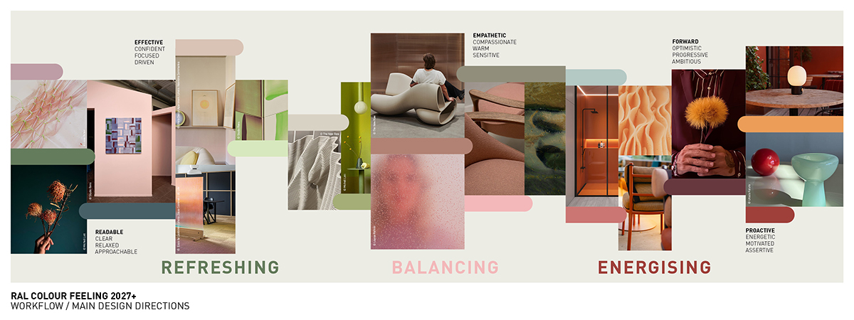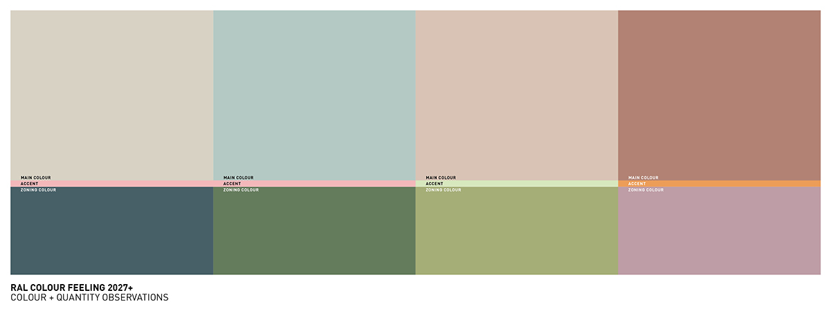 劳尔颜色趋势体验2027+调色板旨在应对当代设计任务的复杂性,如:混合场景使用、自适应房间概念、循环设计原则的整合。每种色调都根据其空间效果、材料适用性和文化共鸣进行了评估。